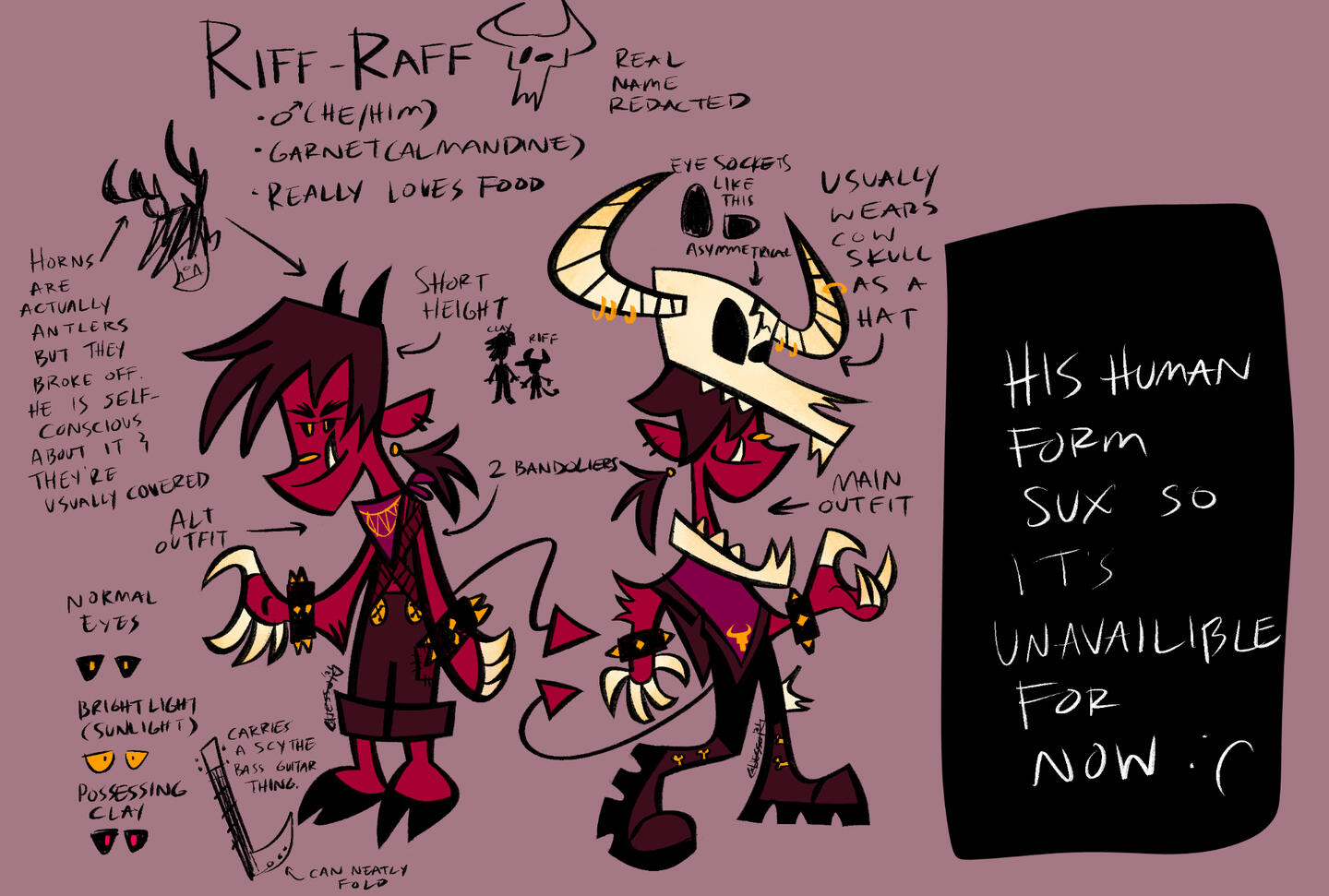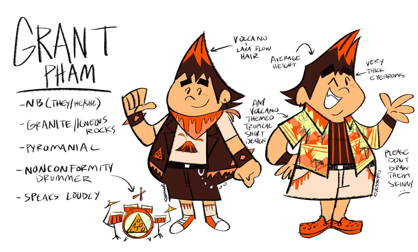 Voice claim: Jake Long (American Dragon: Jake Long) - VA: Dante BascoSinging voice claim: William Beckett (The Academy Is...)Named for claystone (a detrital sedimentary rock composed of clay-sized sediment) and dolomite (a carbonate rock)Speaks with a slight Texas drawl. Speech is slow and fragmented (it’s difficult to figure out when he’s done with his train of thought), uses a lot of contractions like y’all’ve.Knows how to stack a really good sandwich. He thinks it’s his best quality and takes pride in it.Jacket is actually a shredded up blazer he originally used for formal activities.Acts like a tough guy to seem cool but really has fragile feelings.Gets nervous at fast food places and only orders chicken tenders.Has an odd memory where he can remember random things in perfect detail and other things not at all. (I.e. he remembers the exact details of an obscure TV show but will completely forget your birthday.Also has a lot of rock knowledge. He enjoys picking up random rocks on his travels.He’s pretty good at card games.