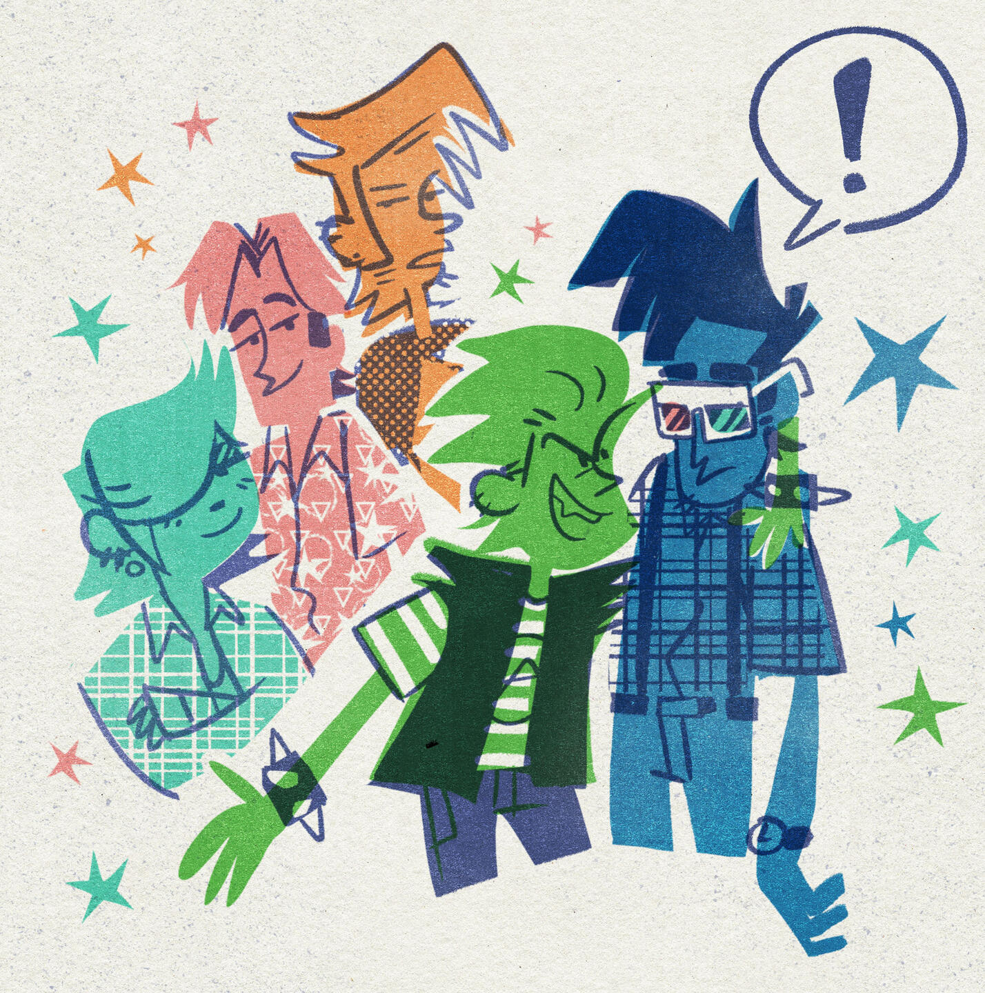 Height is short.Hair is any color dark teal/blue color.Can wear preppy clothes (button up + bow tie & slacks, letterman jacket, suit, etc.) or casual clothes (open button-up + t-shirt).Likes split color palettes (blue + magenta).3-D glasses can be drawn however fits your style.3-D glass lens can also act as “eyes” and show expression (top of lens being “eyebrows”)