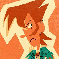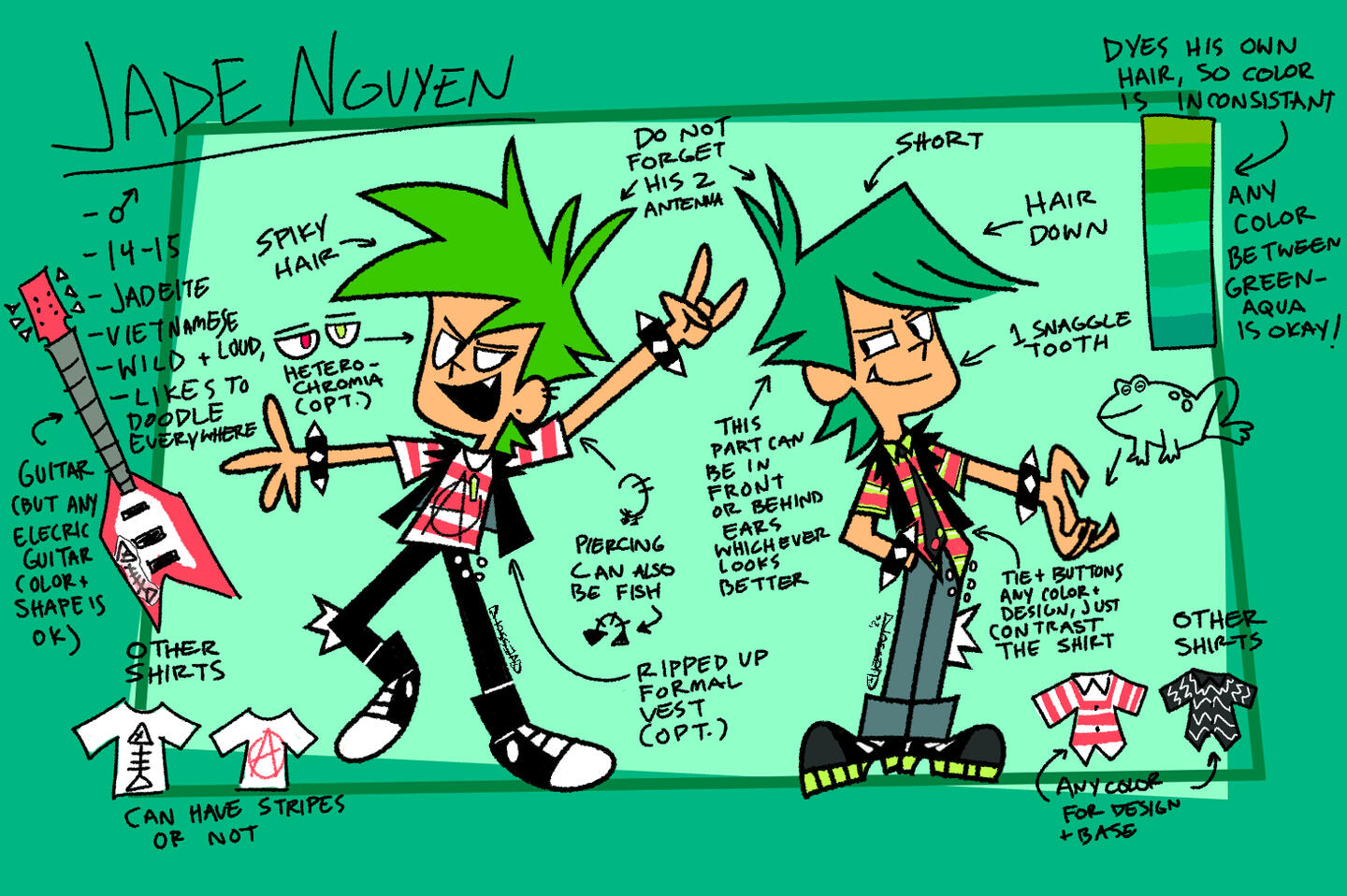 Height is slightly above average, but not 6 ft.Hair is any color between brown-orange to brown-purple.Sideburn (?) things on the side of his head is stiff, but can be drawn pointed or rounded.Choice of fashion is simple alt/punk clothing. Usually a black t-shirt with a band logo or geological symbols on it + red pants.Piercings do not need to all be drawn, but try to include at least 1.