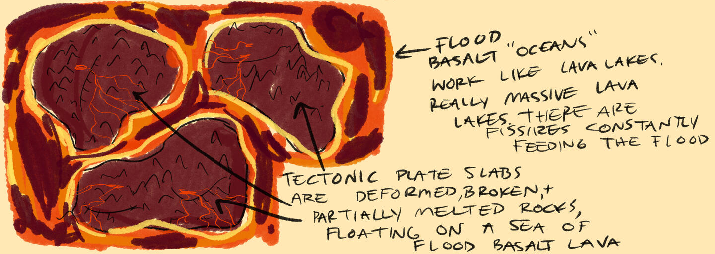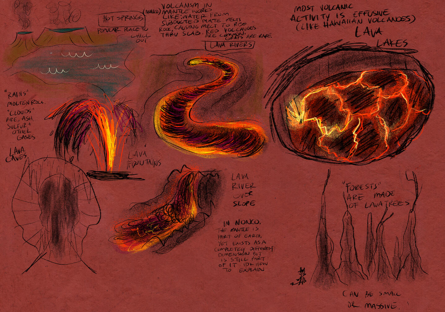 rock/lava cycle works much like water cycle on earth's surface: molten rock rains down, solidifies, vaporizes under intense heat, and condenses again, forming hot ash clouds.subducting plates slide unto the mantle and teleport to this alt dimension, the place is filled with subducted plates floating around on rock and gas.hawaiian-type volcanoes form much of the landscapeflood basalts create lava "oceans" while some surfaces are covered in lava lakes and lava rivers.Hot springs are common, and are popular hangout places.Most civilization are built within and around seamounts that are stuck on the slabs.Atmosphere is a hazy green and red from the gases and incandescent molten rock.Aesthetic: retro-futuristic, sci-fi, steampunk, dieselpunk, grunge
